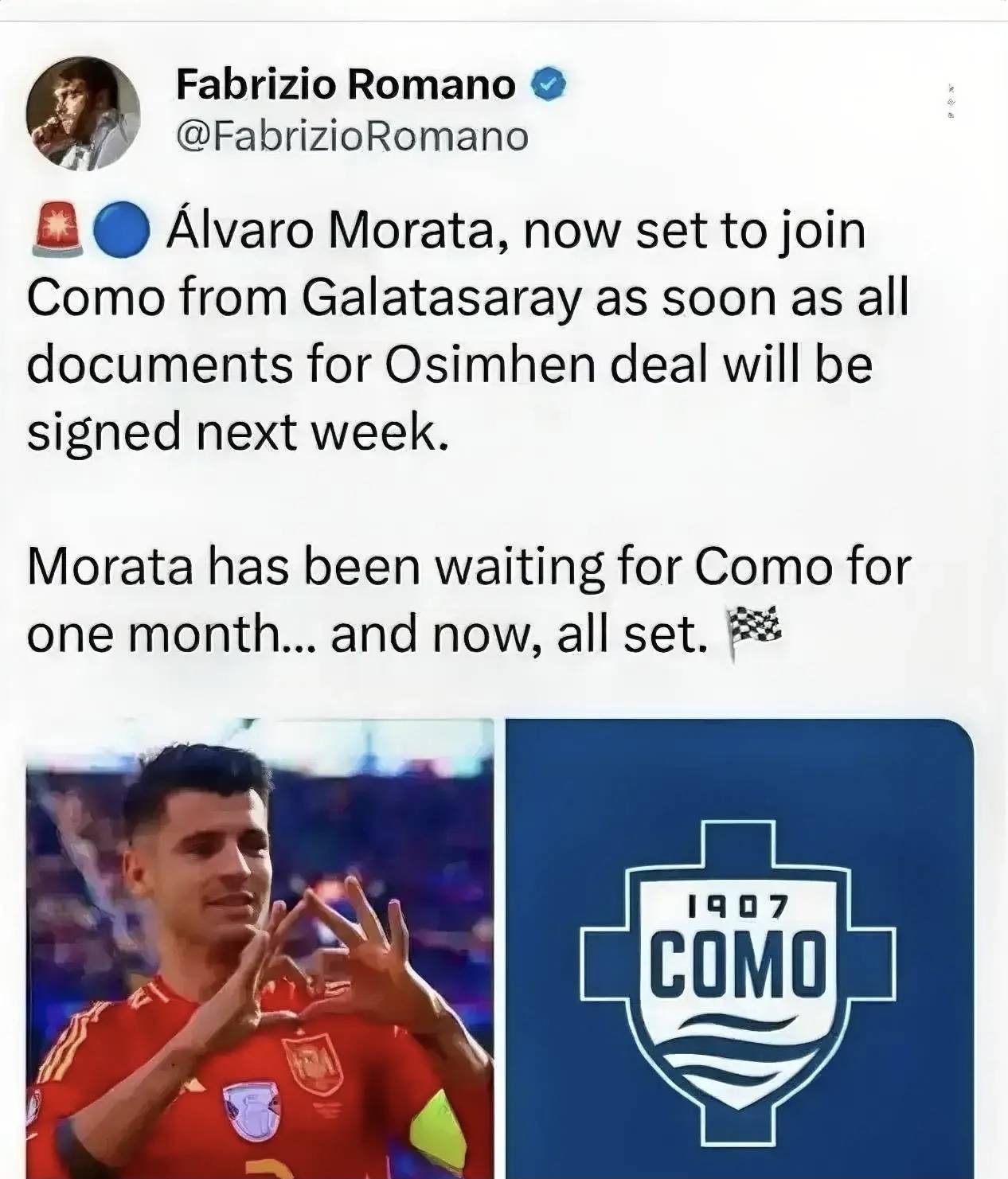 交易即将完成!米兰与加拉塔萨雷俱乐部达成一致,莫拉塔提前结束租借合同,他将返回意大利,但莫拉塔不是回归米兰,而是加盟科莫俱乐部。